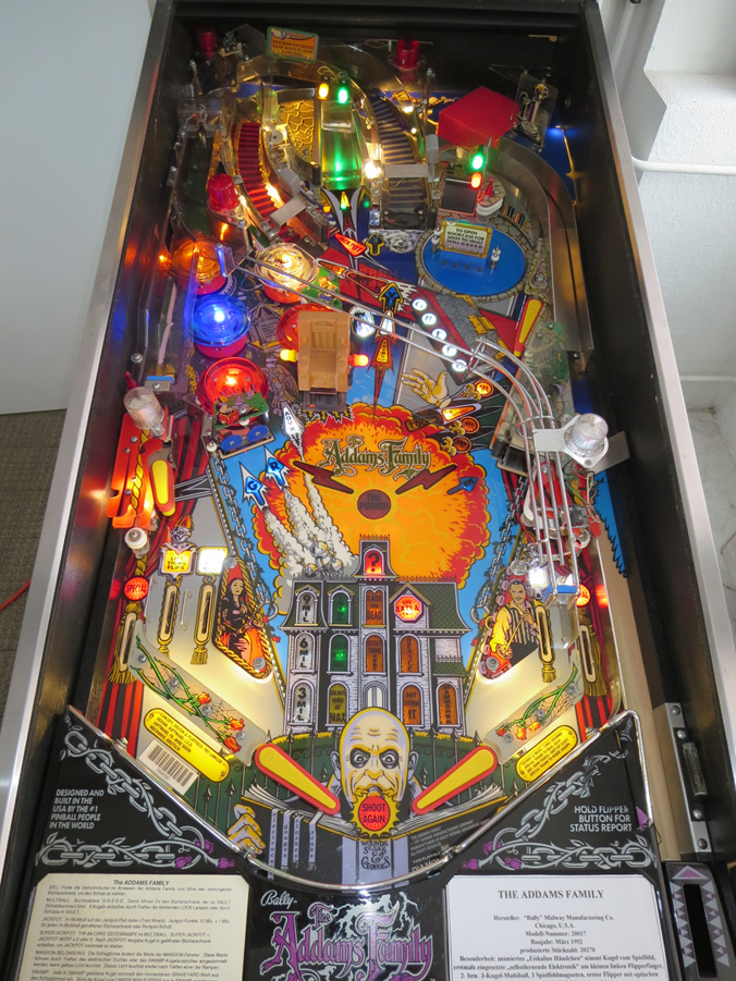 Ein Flipper, der bereits wenige Monate nach seinem Erscheinen zur Legende wurde. Die Designer wuchsen über sich hinaus und schufen ein Gerät das dem Spieler alles bot - lange Schußbahnen, verwinkelte Ecken, 2 Rampen, das bewegliche "Bücherregal", Kugellöcher, 5 Schlagtürme, 2- und 3-Kugel-Multiball. Drei unterirdische Magnete sorgen dafür das die Kugel noch unberechenbarer wurde. Das Top-Feature ist jedoch zweifelsfrei die "Hand" welche die Kugel bei bestimmten Ereignissen einfach aus dem Spiel nahm oder wieder zurücklegte. Dieses Gerät hatte erstmals eine sog. "selbstlernende Elektronik" eingebaut. Der linke kleine Flipperfinger "merkte" sich den Zeitpunkt bei dem der Spieler damit die Kugel traf und kickte diese beim "Thing-Flips"-Modus einfach von selbst von sich!!! Kurzum: Ein Spitzengerät dass man auch Jahre nach dem Produktionsdatum noch in der Spielhalle vorfinden konnte - ein Rekord den bisher noch kein Flipper erreichte!