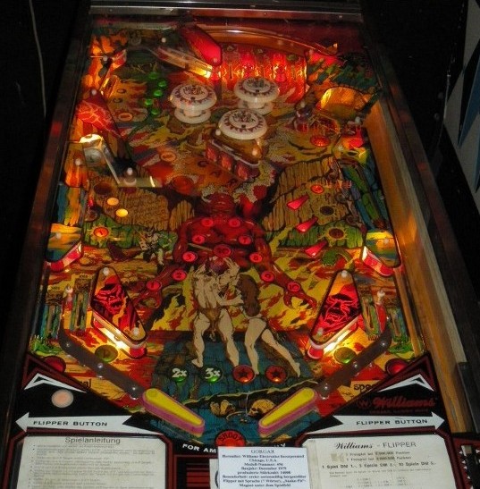 Wie man unschwer erkennen kann wählten die WILLIAMS-Leute ein düsteres Motiv. Dies nahmen damals einige US-Bürger zum Anlaß sich bei der Firma zu beschweren - diesen war das Gerät zu "satanisch". Aber gottseidank blieb der Flipper wie er war. Neben der Sprache (tatsächlich waren es nur ein paar Worte - die damalige Chiptechnik erlaubte noch nicht mehr) und dem interessanten Artwork bietet das Gerät ein überdurchschnittlich gutes Spielfeld - mit dabei das "Snake Pit" (="Schlangengrube") - ein Elektromagnet, der die Kugel ca. 3 Sekunden festhält und dabei bis zu 50 000 Punkte aufzählt.